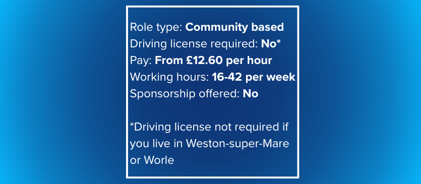 We are looking for empathetic individuals who enjoy working with others to join our team. We don’t mind if you have not worked in the sector before, we provide full training and a shadowing period for all new starters to ensure you are comfortable and ready to work in community.